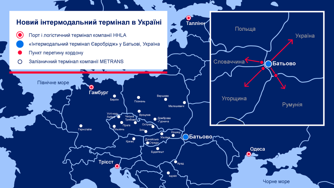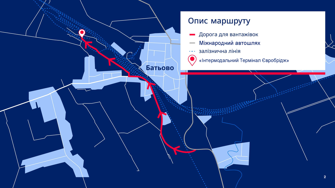«Інтермодальний Термінал Євробрідж» у Батьово дозволяє здійснювати безперешкодні перевезення через прикордонний пункт пропуску «Чоп», з'єднуючи Україну з Угорщиною та Словаччиною. Наявність як європейських вузьких колій (1 435 мм), так і українськмих широких колій (1 520 мм), надає терміналу змогу безперебійно перевозити контейнери та навалювальні вантажі між транспортними мережами. Таке стратегічне розташування гарантує надійне та ефективне переміщення товарів по Україні та Європі.